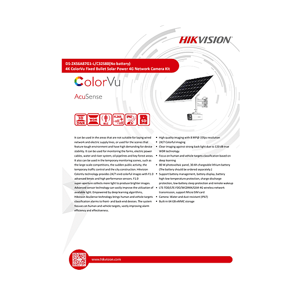 DS-2XS6A87G1-L/C32S80-4MM-NO B CAMERA SOLAIRE COLORVU 8MP 4G